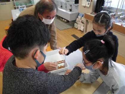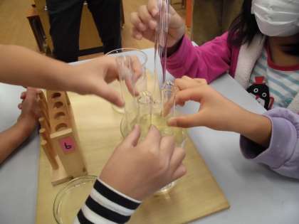 理科の学習で,「空気の温度が変わると空気の体積はどうなるのだろう」という学習問題を立て,実験を行いました。子どもたちは,試験管に石鹸水のまくを張って,お湯につけたり氷水につけたりして,まくが膨らんだりへこんだりする様子を観察しました。お湯につけて石鹸水のまくが膨らむたびに,「また膨らんだ!」と驚いたり喜んだりする声が聞こえました。