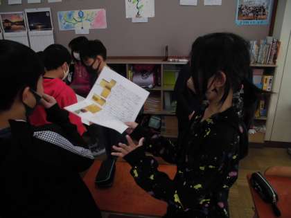 国語「伝統工芸のよさを伝えよう」の学習で,子どもたちが自分で選んだ伝統工芸の良さを伝えるリーフレットを作りました。この時間は,作ったリーフレットを読み合い,お互いに感想を伝えあいました。子どもたちは,「全然知らない伝統工芸品ばかりだ。」と興味をもって読み合っていました。