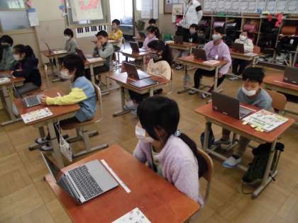 教頭先生と一緒にタブレットの使い方を学習しました。電源の入れ方・ログインのしかたなどを学習しました。初めて使うタブレットにわくわくしながら,難しいパスワードの入力にも挑戦しました。