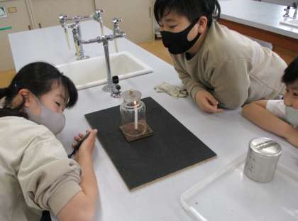 理科「ものの燃え方」の学習で,ろうそくの燃え方について実験をしました。ろうそくに火をつけ,びんで囲み,ふたをします。すると,どうでしょう。十数秒たつと,ろうそくの火が消えたではありませんか。子どもたちは「なぜ消えたのかな?」疑問でいっぱいの表情をしていました。これから燃え方の秘密を解明していきます。