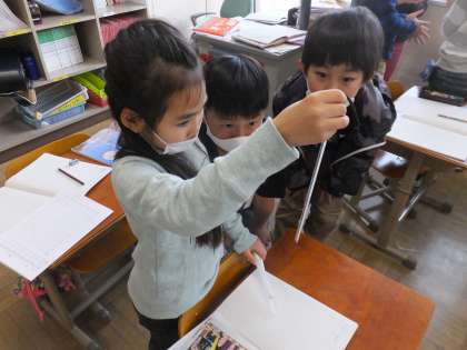 さっそく晴れた今日は,みんなで協力し,初めて使う温度計を一生懸命に見つめながら気温をはかっていました。