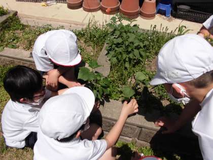 畑に植える前に,何の苗かな?クイズをしました。「茎が紫だからナスかな?」「キュウリはどっちかな?」などとグループの友だちとよく観察しながら答えを考えていました。