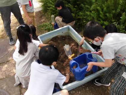 ミニトマトを一人一鉢植えました。畑には,ナス・キュウリ・ピーマンを植えました。これから水やりなどのお世話をしていきます。