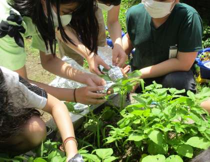 理科の学習で,ジャガイモの葉にでんぷんができるのはどんな時かを調べるための実験の準備をしました。葉にアルミ箔をかぶせて,日光が当たらないようにしたものを作りました。次の日に葉を摘みますが,摘む時間をずらしたり,朝すぐにアルミ箔はがしたりするなどして,いろいろなパターンの葉を作っておきます。明日,どのジャガイモの葉にでんぷんがたくさんできているか,確かめるのが楽しみです。