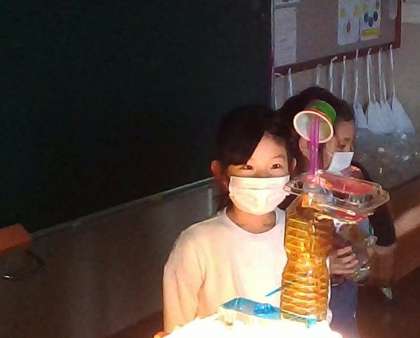 透明な材料を集めて組み立て,色を付けた動物たちが完成してきました。下からライトを当てどんなふうに見えるか試してみました。思っていた以上の出来上がりの見え方に歓声があがりました。