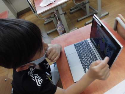パソコンで撮った写真に絵や字をかく学習をしました。自分の顔の周りに名前や好きな絵をかきました。