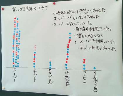 買い物調べの結果をグラフにまとめました。「曜日に関係なくスーパーを利用している」「スーパーをものすごく利用している」など,たくさんのことに気づきました。これから,スーパーではたくさんのお客さんが利用しやすいように,どんな工夫をしているのだろう,ということを調べていきます。保護者のみなさま,ご協力ありがとうございました。