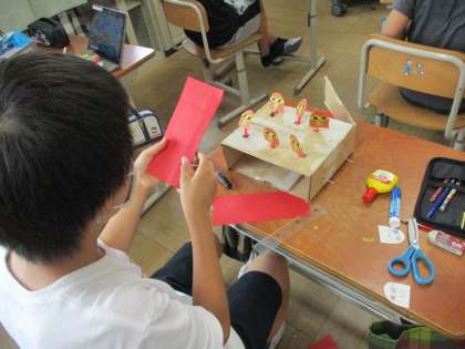 図画工作で取り組んでいる「くるくるクランク」の工作が完成をむかえています。動きを確認しながら細かいところまで丁寧に作る姿が見られました。箱の周りも飾りやアイテムを作り,その世界観が表れるように工夫していました。