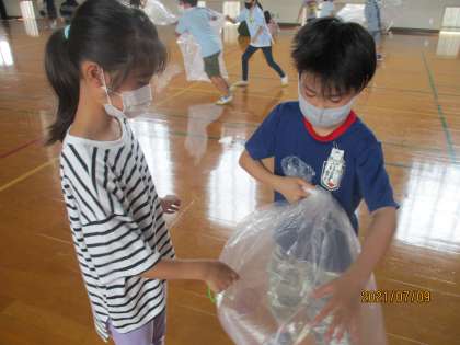 理科では新しい学習が始まりました。「とじこめた空気や水」という学習の始まりに,今日はみんなで見えない空気を集める方法について考えました。体育館で大きな袋をもって走り回り,空気をつかまえました。触ることのできない空気もこうすれば触ることができる!とっても楽しみながら学習に取り組むことができました。
