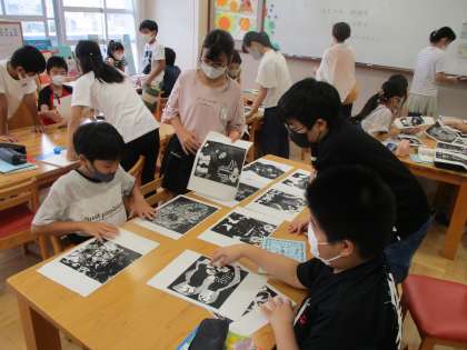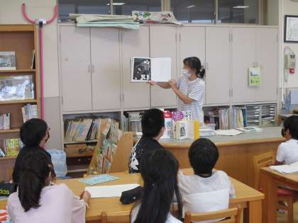 国語科でで宮沢賢治の「やまなし」の学習をしていきます。学校司書の宮城先生に宮沢賢治について紹介していただき,その後「注文の多い料理店」を読み聞かせしていただきました。後で,挿絵の並び替えクイズがあり,子どもたちは相談しながら物語の順序を確かめていました。
