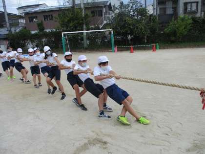 体育では,ラジオ体操の練習をした後に綱引きをしました。棒引きの時は,3人対3人で行いましたが,綱引きは10人対10人でしました。何試合か行いましたが,子どもたちは最後まで元気に楽しんで綱引きをしていました。