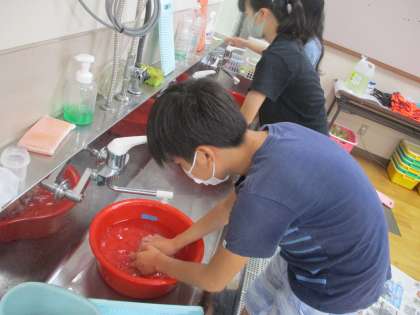 家庭科で,洗濯実習をしました。手洗いの洗濯の仕方を学習し,自分のくつ下を実際に洗いました。子どもたちは,もみ洗いをしたり洗濯板を使ってこすり洗いをしたり,汚れを落とそうと一生懸命でした。また,お家でも実践してほしいと思います。