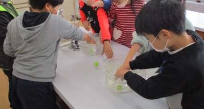 理科の学習では,身近にあるいろいろなものを温めたり冷やしたりして,体積に変化があるのかどうか実験を進めています。今日は金属についての実験をした後,空気はあたためたり冷やしたりしたらどうなるのかなと予想を立てる時間でした。ペットボトルを氷水やお湯につけながら新発見がいっぱい。これからの学習が楽しみです。