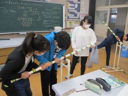 理科「てこのはたらき」の学習で,実験道具を使って,重さを同じにして,支点から力点や作用点の距離の関係を調べました。同じ重さですが,力点や作用点を変えていくことで,自分が感じる重さが全然違うということに気付きました。