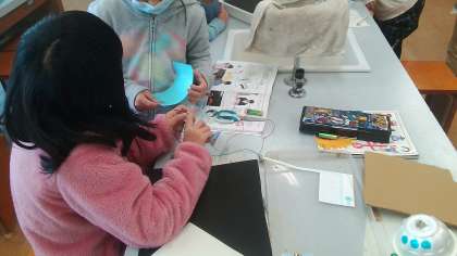 学習のまとめとして,明かりがつくおもちゃを作りました。セロハンテープが回路のじゃまをしていないかな,乾電池と導線の金属部分はしっかりついているかな,など確かめながらゆかいなおもちゃを作りました。