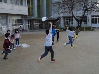 生活科の「ふゆとともだち」の単元では,めんこで遊んだり,凧揚げをしました。凧揚げは袋に絵を描くところから始めました。カラフルな凧があがってとてもきれいでした。