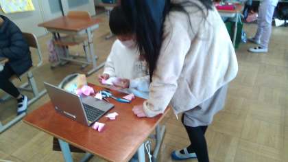 6年生の卒業に向けて準備が始まりました。廊下のかざりの桜を作っています。他にも,会の出し物,色紙のメッセージなど,「ありがとう」の気持ちをこめて取り組んでいきます。