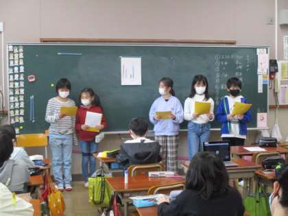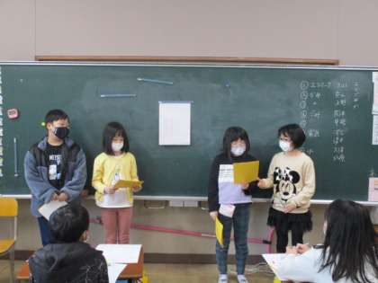 学校では,私たちは本当に環境にいい暮らしができているのかということについて各グループごと調査を進めていました。アンケートやインタビューをして分かったことをまとめて発表しました。水が出しっぱなしになっていたら,止めようと意識してほしいということや,使わない時には電気を消してほしいなど,各グループから環境に良い行動をとってほしいとみんなへのメッセージも伝えてくれました。