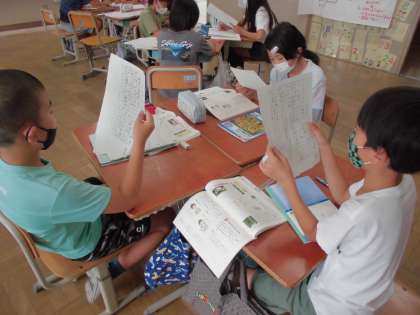 国語科の学習「新聞を作ろう」では,学校の良さや最近のニュース,4年1組の紹介など,それぞれが記事を担当し,グループごとに新聞を作っています。この日はそれぞれが取材したことやアンケートをもとに,記事の下書きをしました。出来上がりが楽しみです!