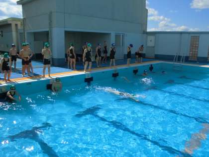 水泳学習も6回目となり,初めのころに比べると,みんなバタ足やクロールがうまくできるようになってきました。3年生にアドバイスをしながら,自分の力を伸ばすために一生懸命です。