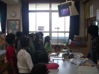 11月24日,4年生の理科の研究授業を行いました。今日は『ものの温度と体積』の「金属は温度によって体積が変わるのだろうか。」という学習でした。金属球を2人で相談しながら温めたり冷やしたりして輪の通り具合を調べました。金属片の熱膨張を顕微鏡の映像を見て,「増えている。」「広がっている。」と,子ども達は驚いていました。