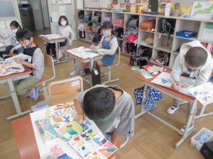図画工作科の時間には「えっ!私だけの学校?」という絵本を読んで想像したことを絵に表す学習に取り組んでいます。自分が思い描いた一つ一つの場面を,丁寧に少しずつ色をつけています。みんな少しずつ形になっていく自分の絵を大切にしていて,本当に一生懸命頑張っています。完成が楽しみです!