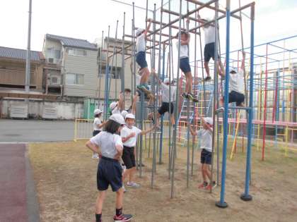 体育科では、鉄棒の学習を始めました。苦手意識をもつ子が多いようですが,互いに声をかけあって,苦手を克服しようと学び合う姿が見られます。腕の力も大切だねという話から,うんていやのぼり棒なども準備体操をする中で取り組むことにしました。