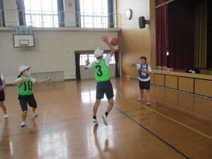 体育科の学習でバスケットボールをしています。チームでパスをつないでシュートし、みんなで楽しむことをねらいにしています。パスをもらうのはどこがいいか、どんなパスが通りやすいかなど、それぞれ考えて工夫しながらゲームを楽しんでいます。