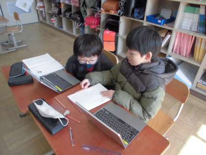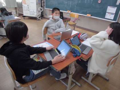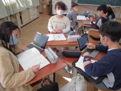 冬の言葉を集めて,その中から思い描く「冬の楽しみ」を俳句で表現することに取り組みました。まずは自分で考え,その後はグループに分かれて相談会を行いました。言葉の順番を並べ替えたり,よりよい表現を見つけたり。友達同士でアドバイスしながらよりよい一句が出来上がったようです。