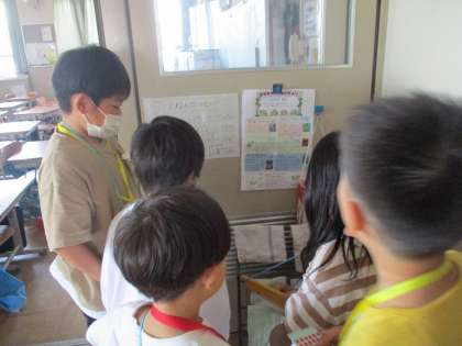ポスターの教室紹介のポスターを1年生に読み、やさしく教える姿がとてもたのもしく、微笑ましかったです。