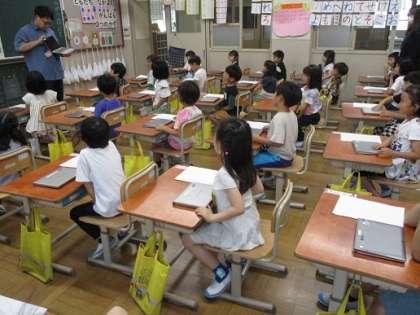 タブレットを大切に扱うように話をした後、いよいよ一人ひとりにタブレットを渡しました。今日は自分の「ID」と「パスワード」を知り、「ログイン」をしました。