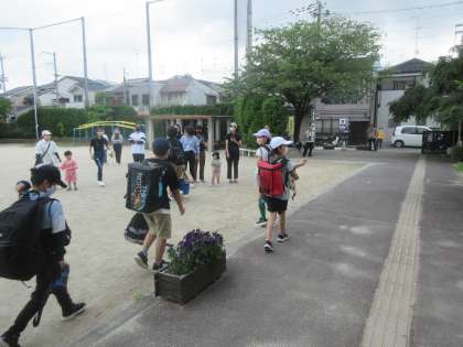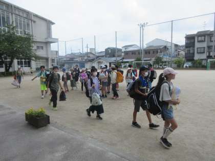 学校を出発するところの様子です。これから、九条通りに来ているバスに乗りこみます。子どもたちのワクワクしている気持ちがよく伝わってきます。