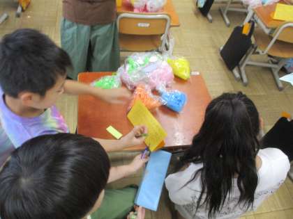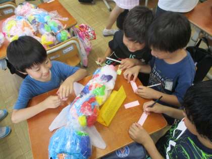 袋に花紙や布を詰めてカラフルフレンドをつくりました。