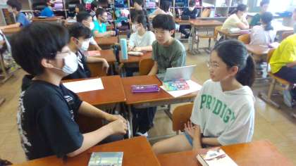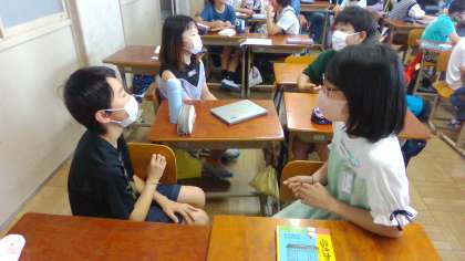 毎週金曜日の朝はお話タイムという取組をしています。2分間テーマを決めて,回答者と質問者に分かれてお話を続けます。今週のテーマは「宇宙人はいると思う?いないと思う?」でした。「もしも,いるとしたら,どの星に住んでいると思いますか?」「もし会えたら何を話したいですか?」など,楽しそうな会話が飛び交っていました。相手の話に興味をもって話を続けられる力を身につけられたらいいですね。