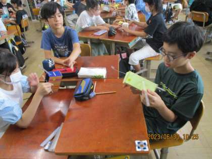 クランクの仕組みを利用して,動くおもちゃを作る学習が始まりました。この日はいろいろなパターンの見本を見ながら,何が動くようなデザインにすれば楽しい作品ができるかを考える時間にしました。グループで動きを確かめながら,イメージを膨らませる良い時間になりました。