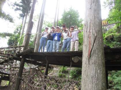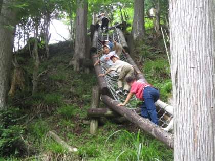 雨が降りそうだったので、プログラムを変更してみんなが楽しみにしている「冒険の森」へ行くことになりました。ルールを守って楽しもうね。