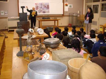 3年生が学校運営協議会の理事さんに来ていただいて,昔の道具についてお話をしていただきました。