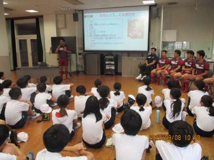 島津製作所に所属されているラグビー選手が来てくださり、自分たちが島津製作所という会社で仕事をしながらラグビー選手としても活躍するという生き方についてお話してくださいました。日々の生活の中で大切にしていることや、ラグビーというスポーツにおいて大切にされている考え方などを教わり、自分たちの学校生活に置き換えて、チームワークを大切にすることや決まりを守って生活することの大切さについても考えることができました。