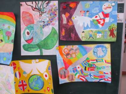 毎年5・6年生が書いている平和記念ポスター。平和とは何かについて考えたり、想像を膨らませたりして平和を願うポスターを描きました。とてもすてきな作品ができました。