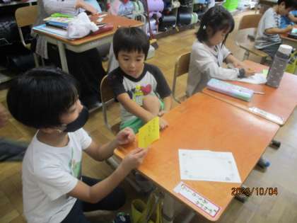 運動会を終えて、他学年の良いところもたくさん見つけることができました。素敵なところをキラキラカードに書いて、届けに行きました。5年生に向けては、「来年は最高学年として学校全体を引っ張っていってください。」というメッセージを、1年生には「いつもとは違う姿が見られて、とてもかっこよかったよ。」というメッセージを添えて渡しに行くと、カードをもらったほうもとても嬉しそうでした。