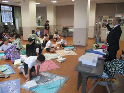伝統文化の魅力を知る学習を進めている総合的な学習の時間に、今回は風呂敷を取り扱っておられる会社の方にきていただき、風呂敷の歴史や使い方について教えていただきました。たった1枚の布が、使い方によって、いろいろなものを運んだり包んだりすることができるものに変わる、とても便利なものだということを実感することができました。これからも自分たちにできることを広めていきたいですね。