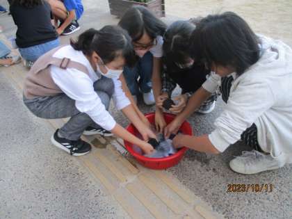 家庭科の学習では、洗濯の仕方について学びました。今や、洗濯機に洗濯物を入れてしまえば勝手にきれいになっている、という時代。しかし、昔は一つ一つ手洗いをしていたことを知り、今でも部分的に強い汚れなどを落とす場合には手で洗うことも必要だということを学びました。そして実際に自分の履いていた靴下を洗う実習をしました。お家でも、学習したことを生かしていけたらいいですね。