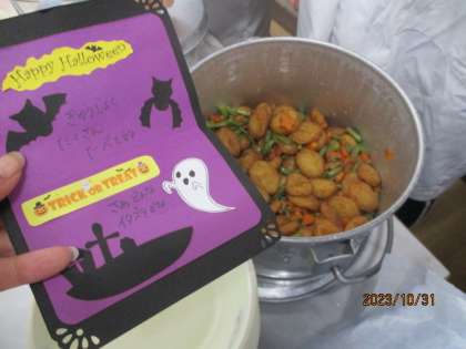 給食室へ食缶を取りに行くと、調理員さんからのメッセージカードが!「調理員さんのイタズラがあるかも・・・?!」と。