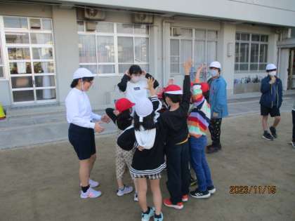にこにこ遊びも回数を重ねるごとに、どのグループも進め方が上手になってきました。はじめは、みんなに話を聞いてもらうにはどうしたらよいのかと必死でしたが、今では自分たちも楽しみながら、下級生と笑顔で過ごす様子が見られます。下級生がいるから成長できる、それが最高学年の良いところですね!