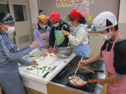 家庭科の調理実習では、ベーコンの野菜巻きを作りました。食材によって切り方や湯で加減などを館挙げながら、ベーコンで巻いて焼き加減も工夫しながら仕上げることができました。給食と一緒に、ランチルームでいただきました。とても美味しくいただくことができましたね!