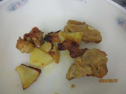 今日は新献立の『タンドリーチキン』でした。『タンドリーチキン』は,インドで生まれた料理です。カレー粉・塩・トマトケチャップ・しょうゆ・みじん切りにしたにんにくを混ぜてタレを作り,その中に鶏肉を入れて味をしみ込ませます。その後に米粉をまぶして,ジャガイモと鶏肉を混ぜてから容器に並べてスチームコンベクションオーブンを使って焼きました。鶏肉とじゃがいもの表面はカリッと,中はふっくらしていて子ども達にも大好評でした。