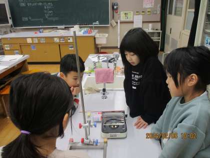 理科で「もののあたたまり方」の単元に入りました。「あたためる」ものにはどんなものがあるかを考えました。「スープをあたためる」「なべであたためる」「エアコンは空気をあたためてるなぁ」など色々あたためるものについて話をしました。「金属」「水」「空気」はどのようにあたたまるのかを予想して実験で確かめました。コンロの使い方もしっかり確認して・・・「火の当たっているところからだんだん遠くへ温まっている」ことを確かめることができました。