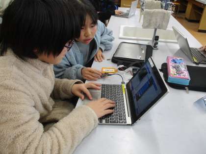 理科の学習では、私たちの生活と電気について学んでいます。マイクロビットというソフトを使って、LEDのパネルにプログラムを送ります。自分で考えて命令を送ったことが、実際に反応する様子をグループのみんなで見て、とても楽しそうに学習に取り組んでいました。