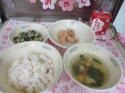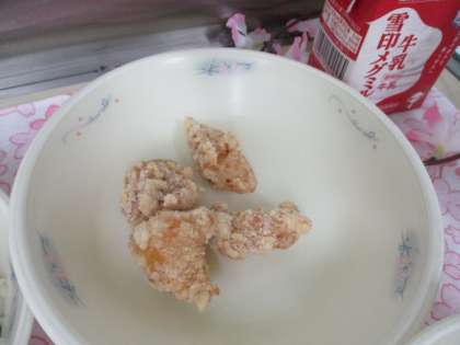 『鶏肉のこはくあげ』は,味がよくしみ込むように,みじん切りにしたしょうがと料理酒・しょうゆを30分位つけてから,片栗粉と米粉をまぶして油で揚げました。「冷めてもサクサクしてます」と検食に来た教頭先生が言っていました。