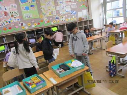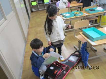 黒板の絵を見て、自分で考えて準備を始めました。「できた!」という声や「だいじょうぶ?」「このかばんは机の横にかけるんやって」など友達と教え合いながら準備する姿も見られました!